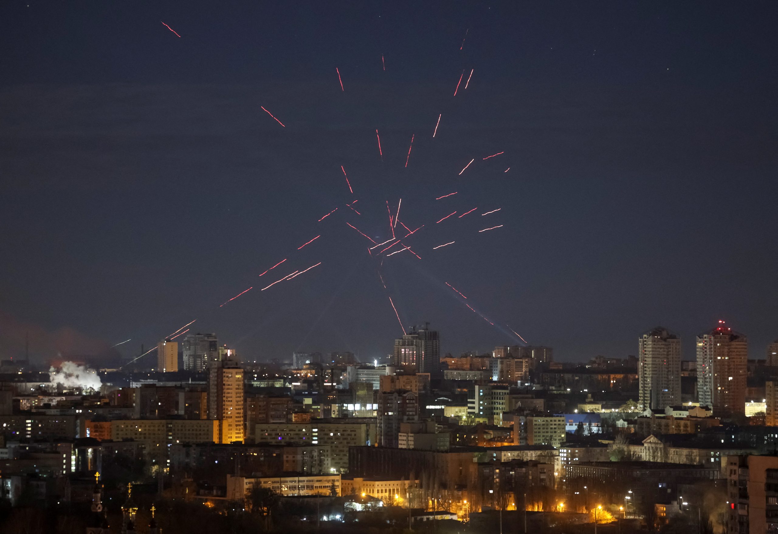 Ο δήμαρχος του Κιέβου, Βιτάλι Κλίτσκο, ανακοίνωσε ότι ως αποτέλεσμα της ρωσικής επίθεσης, πυρκαγιές ξέσπασαν στις συνοικίες Svyatoshinsky και Darnitsky της πρωτεύουσας και δύο άτομα τραυματίστηκαν.