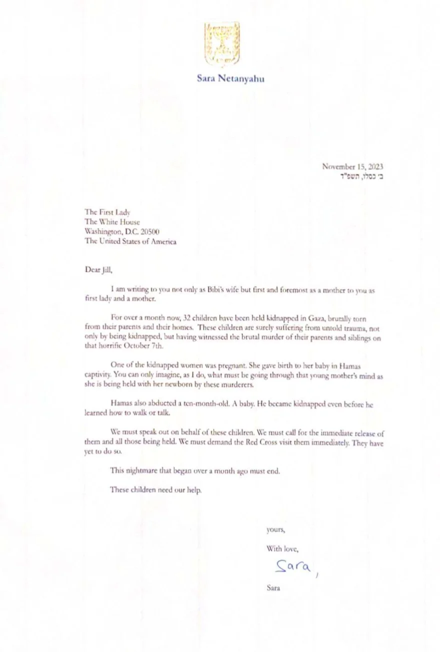 Η σύζυγος του Μπενιαμίν Νετανιάχου, Σάρα, έστειλε μια συγκινητική επιστολή στην Πρώτη Κυρία των ΗΠΑ, Τζιλ Μπάιντεν με αφορμή τα παιδιά που κρατούνται αιχμάλωτη στη Λωρίδα της Γάζας από τους μαχητές της Χαμάς.