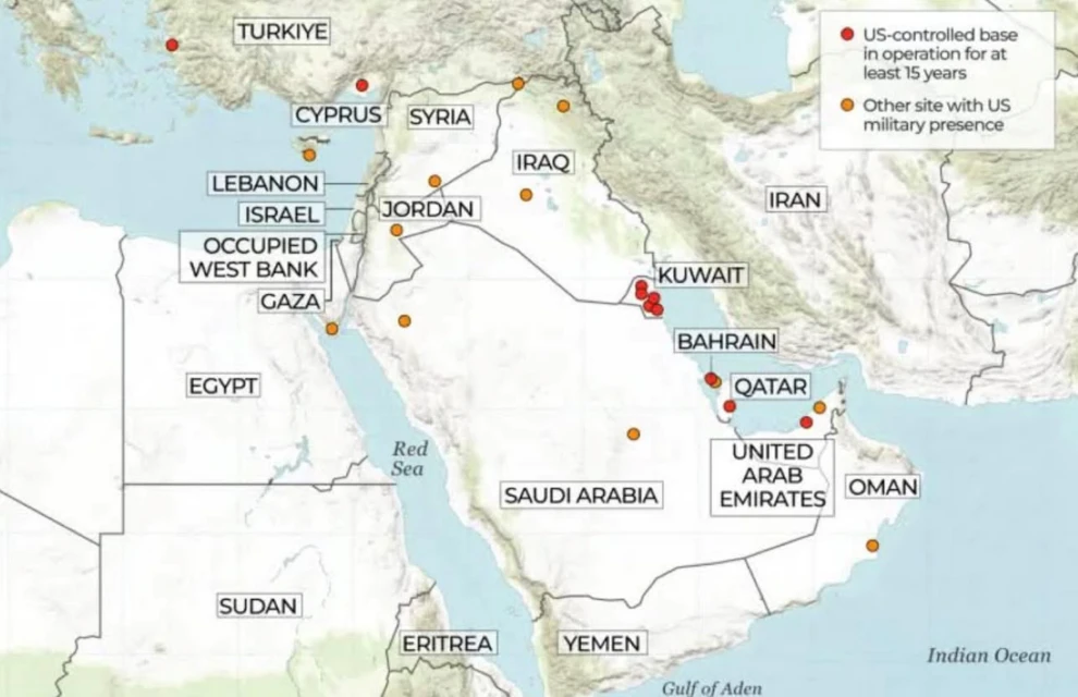 Οι ΗΠΑ λειτουργούν ένα ευρύ δίκτυο στρατιωτικών βάσεων σε τουλάχιστον 19 τοποθεσίες στην ευρύτερη περιοχή της Μέσης Ανατολής.
