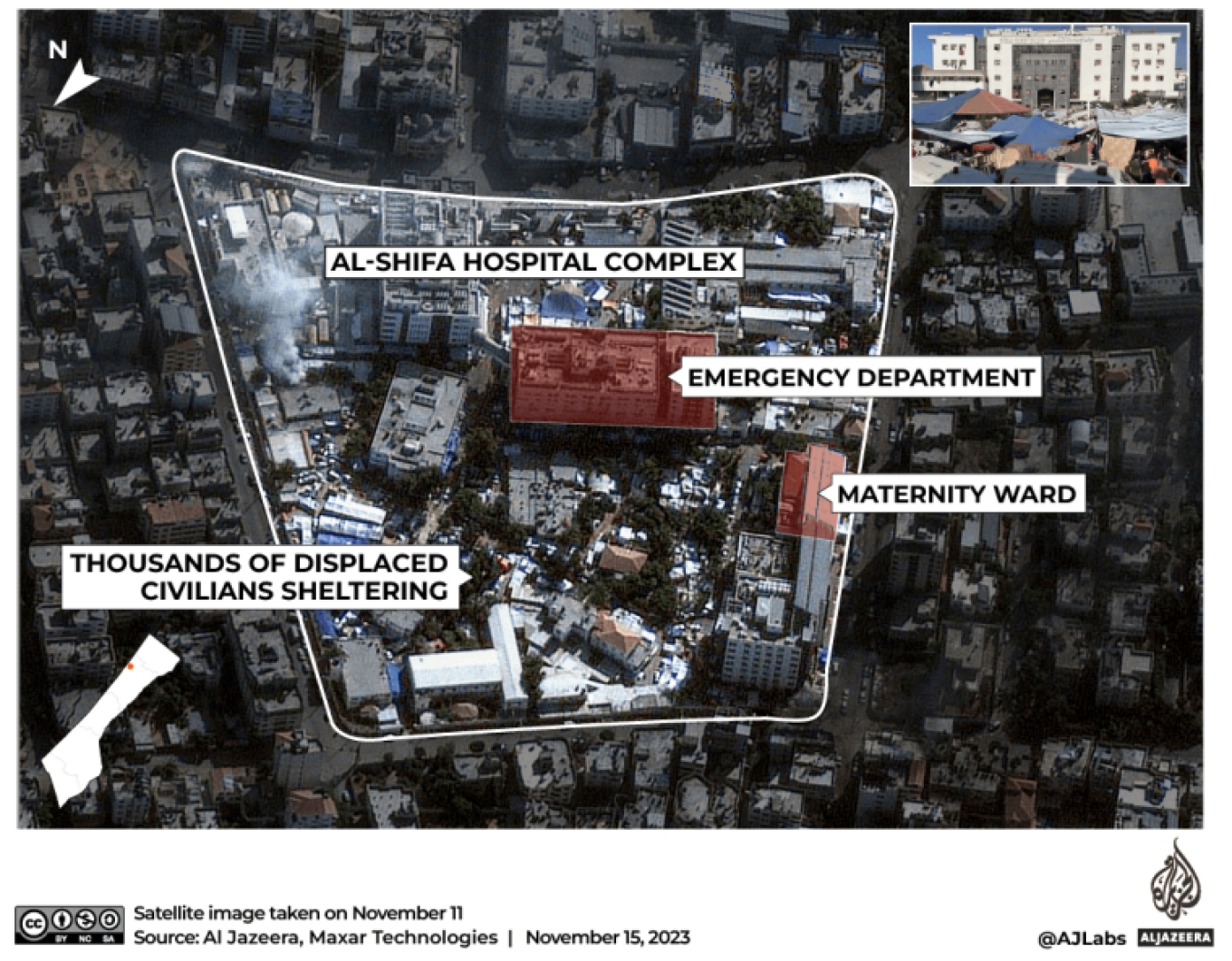 Στο πλαίσιο της χερσαίας επίθεσής του στη βόρεια Γάζα, μπήκε και περικύκλωσε το μεγαλύτερο νοσοκομείο της Λωρίδας με στρατιώτες, άρματα μάχης, τεθωρακισμένα οχήματα και επιθετικά μη επανδρωμένα αεροσκάφη με την υποστήριξη ελεύθερων σκοπευτών. Τα ισραηλινά στρατεύματα έχουν πλέον εισέλθει στο νοσοκομείο και έχουν πραγματοποιήσει επιδρομές σε διάφορα τμήματα. Έστησαν ηλεκτρονικά σημεία ελέγχου σε πολλές πόρτες των κύριων κτιρίων. Τα τανκς τους βρέθηκαν στην αυλή.
