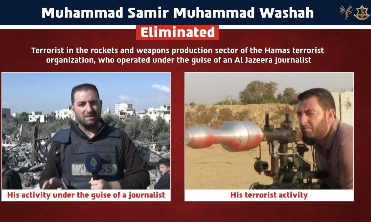 Σύμφωνα με το Ισραήλ, ο Muhammad Samir Muhammad Washah, που εργαζόταν ως δημοσιογράφος για το δίκτυο Al Jazeera, φέρεται να είχε ενεργό ρόλο σε εγκαταστάσεις της Χαμάς που σχετίζονται με την παραγωγή ρουκετών και οπλισμού, ενώ φέρεται να συμμετείχε και στη διακίνηση όπλων εντός της Γάζας.