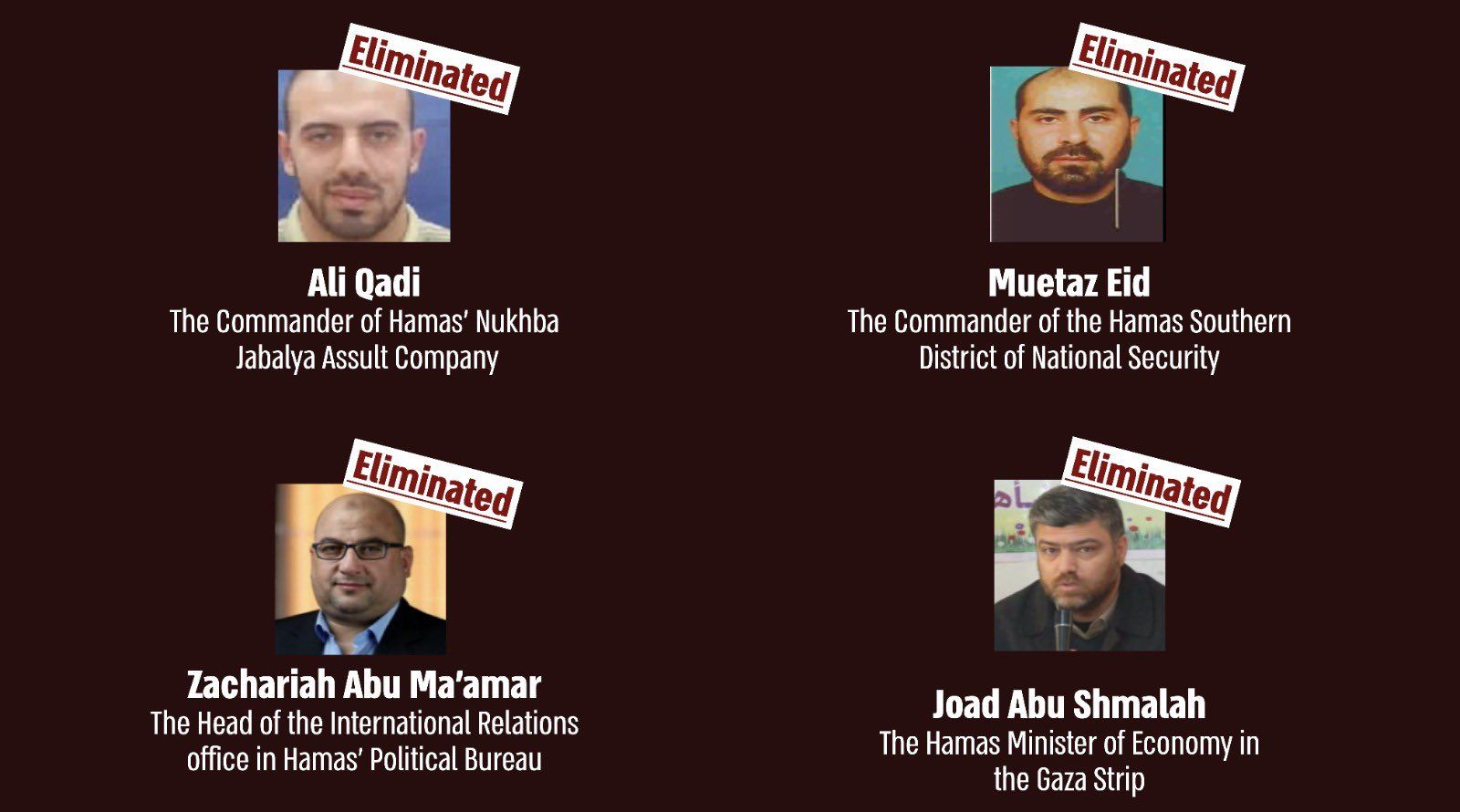 Στην ανακοίνωση του ισραηλινού στρατού κατονομάζονται επίσης δύο υψηλόβαθμοι αξιωματούχοι της Χαμάς που φέρεται να σκοτώθηκαν την περασμένη εβδομάδα, ο υπουργός Οικονομίας της Χαμάς Τζάουαντ Αμπού Σαμάλα και ο Ζακάρια Αμπού Μάαμαρ, ο οποίος φέρεται ότι ήταν υπεύθυνος για τις διεθνείς σχέσεις.