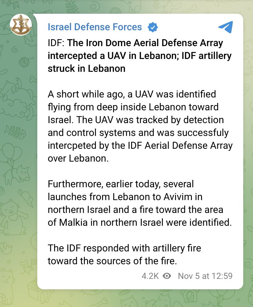 Ο ισραηλινός Στρατός, ανακοίνωσε ότι το αμυντικό σύστημα Iron Dome αναχαίτισε ένα μη επανδρωμένο αεροσκάφος (drone) «που πετούσε από τον Λίβανο προς το Ισραήλ».