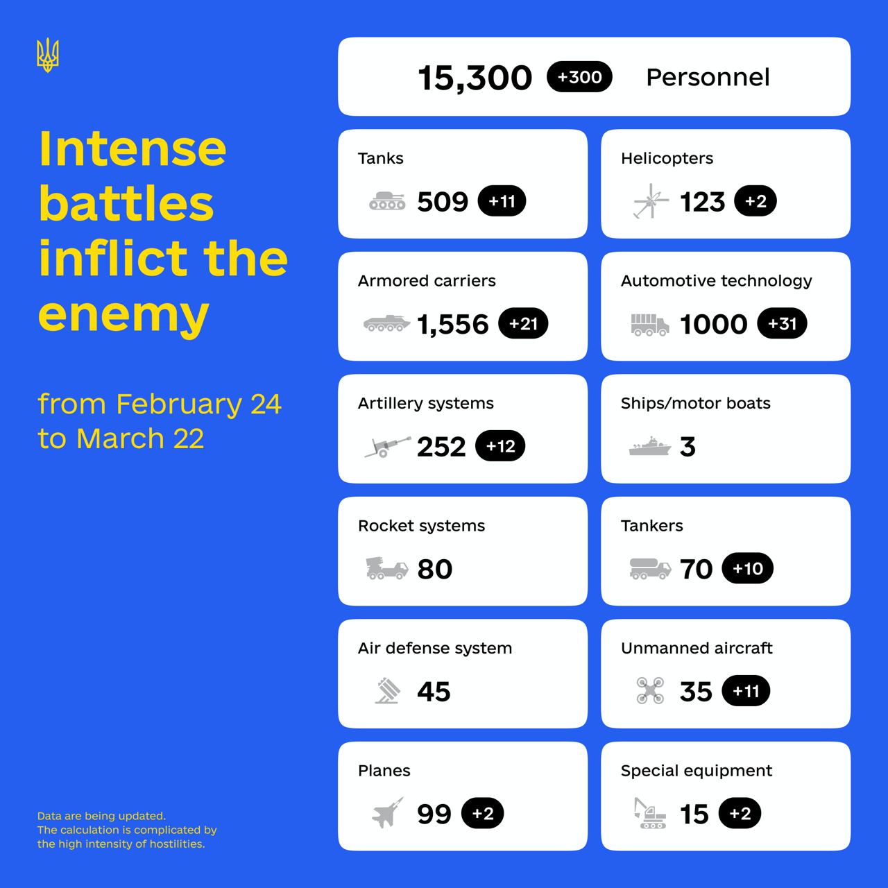 Σύμφωνα με αυτή την ενημέρωση, άλλοι 300 Ρώσοι στρατιώτες σκοτώθηκαν και πλέον οι νεκροί Ρώσοι ανέρχονται σε 15.300. Να σημειώσουμε ότι τα αμερικανικά ΜΜΕ εκτιμούν τις απώλειες των Ρώσων στρατιωτών σε περίπου 7.000.