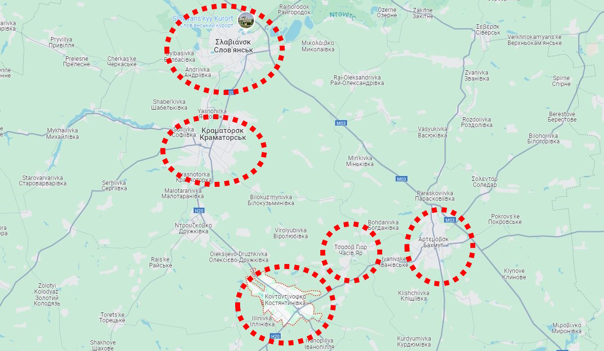 Το Ινστιτούτο για τη Μελέτη του Πολέμου (IWS) που εδρεύει στην Ουάσιγκτον περιγράφει τις παραπάνω πόλεις ως τη «ραχοκοκαλιά» της άμυνας του ουκρανικού στρατού στα ανατολικά.