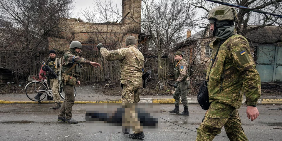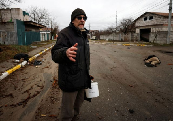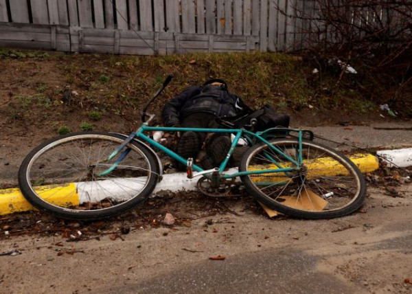 Δημοσιογράφοι του Γαλλικού Πρακτορείου είδαν τουλάχιστον 20 πτώματα, όλα με πολιτικά ρούχα, διασκορπισμένα σε έναν μόνο δρόμο στην Μπούχα, ενώ το πτώμα ενός αγνοούμενου Ουκρανού φωτογράφου, του Μαξίμ Λεβίν, ανακαλύφθηκε σε ένα κοντινό χωριό.