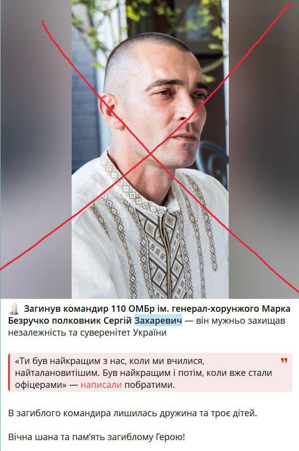 Ο Σεργκέι Ζαχάρεβιτς, διοικητής της 110ης Μηχανοκίνητης Ταξιαρχίας του ουκρανικού Στρατού εξοντώθηκε πρόσφατα, σύμφωνα με ενημέρωση που διέρρευσε από ουκρανικές πηγές, μετά από πλήγμα κτηρίου – στο οποίο βρισκόταν και ο ίδιος – από ρωσικό πύραυλο Iskander-M.