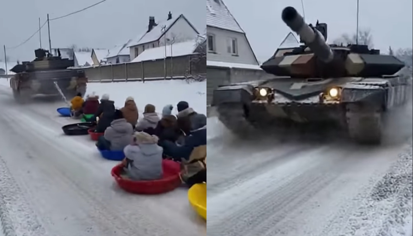 Βίντεο που καταγράφηκε στο Ντονέτσκ, δείχνει ένα ρωσικό άρμα μάχης Τ-90 διασκεδάζει δεκάδες παιδιά τραβώντας τα με έλκηθρο.