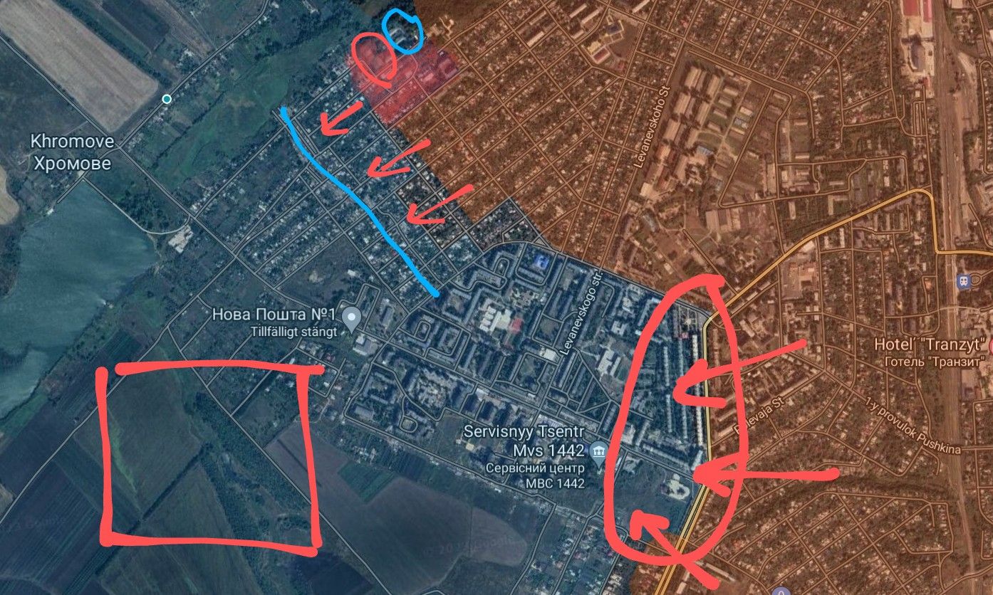 Η πρώτη ήταν προς το Ολυμπιακό σχολείο (μπλε κύκλος ) και το ταχυδρομείο (κόκκινος κύκλος) στα βόρεια. Το Ταχυδρομείο και η γύρω περιοχή καταλήφθηκαν από τις δυνάμεις της Wagner, αλλά εξακολουθεί να υπάρχει σκληρή αντίσταση στο Ολυμπιακό σχολείο.