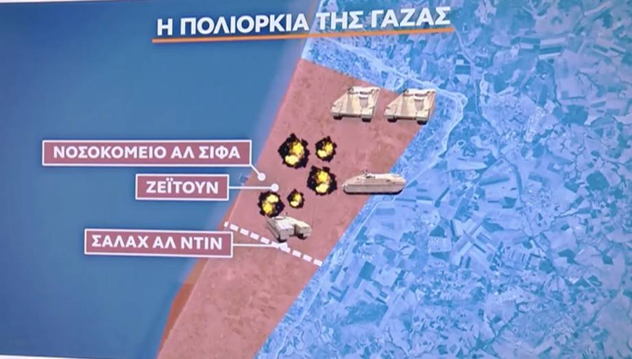 Σύμφωνα με γράφημα του OPEN, ο ισραηλινός στρατός, κινούμενος από τα ανατολικά βρίσκεται στα περίχωρα της πόλης της Γάζας, όπου βρίσκεται ένας από τους πολύ βασικούς στόχους, σύμφωνα πάντα και με το βίντεο που έδωσε στη δημοσιότητα ο IDF την Παρασκευή, το νοσοκομείο Αλ Σίφα.