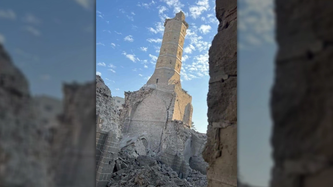 Φωτογραφίες που κυκλοφόρησαν από μέσα ενημέρωσης της Χαμάς στη Γάζα και τις οποίες το Reuters δεν μπόρεσε να επαληθεύσει αμέσως δείχνουν μεγάλες ζημιές στο τέμενος, με πεσμένους τοίχους και στέγες και μια τεράστια ρωγμή στο κάτω μέρος του πέτρινου μιναρέ.