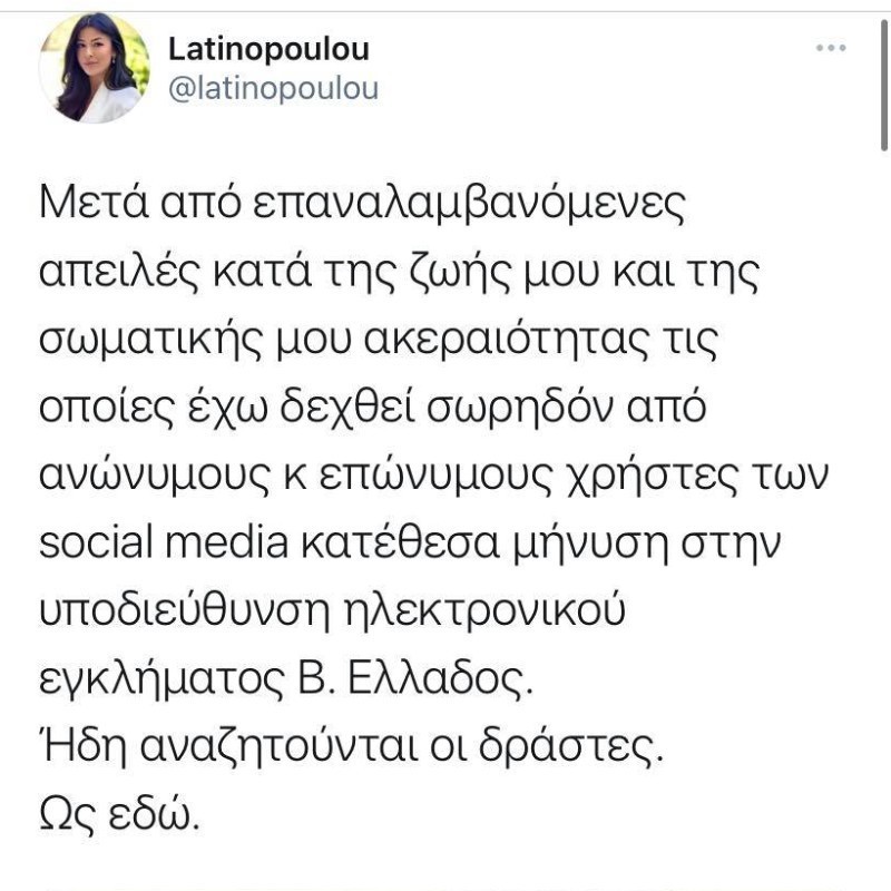 Μέσω λοιπόν μιας ανάρτησης της, η Αφροδίτη Λατινοπούλου ξέσπασε έντονα, μιας και δέχεται απειλές για την σωματική της ακεραιτότητα.