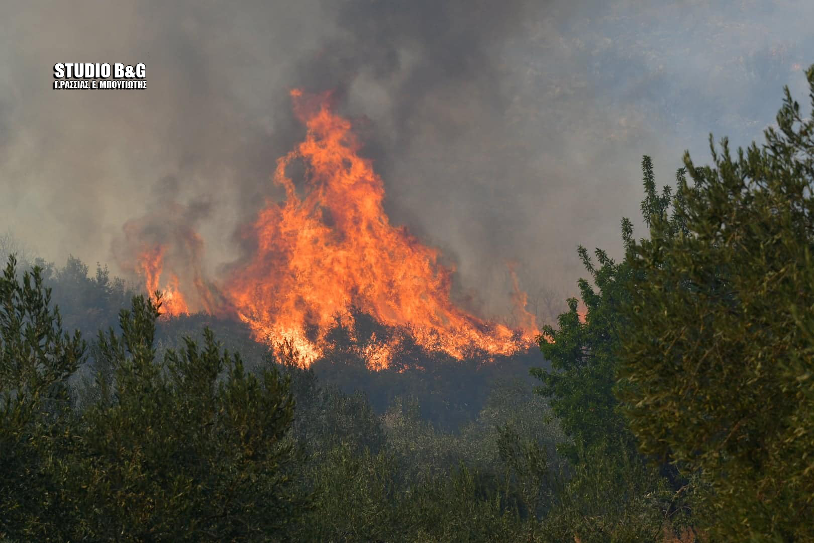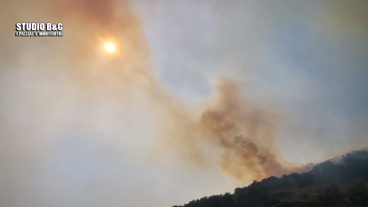 Στην Αργολίδα η φωτιά επεκτείνεται με αποτέλεσμα να εκκενωθεί πριν λίγο, το χωριό Γκάτζια.