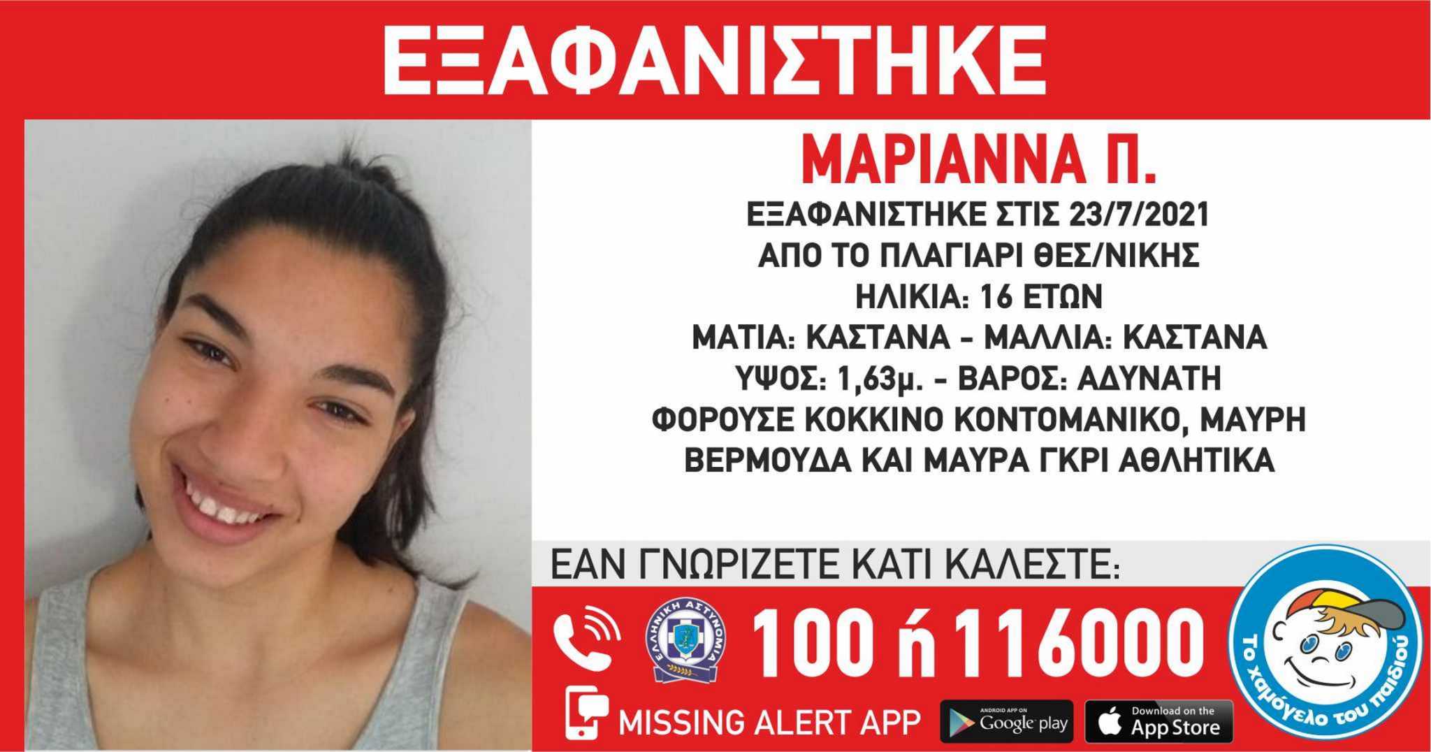 Σύμφωνα με όσα ανακοίνωσε το Χαμόγελο του Παιδιού για τη νέα εξαφάνιση, «στις 23/7/2021, απογευματινές ώρες, εξαφανίστηκε από το πλαίσιο που τη φιλοξενούσε στο Πλαγιάρι Θεσσαλονίκης, η Μαριάννα Π. 16 ετών, ελληνικής καταγωγής. Η Μαριάννα Π. έχει ύψος 1.63 μ., είναι αδύνατη, έχει καστανά μαλλιά και καστανά μάτια. Φορούσε κόκκινο κοντομάνικο, μαύρη βερμούδα, και μαύρα- γκρι παπούτσια».