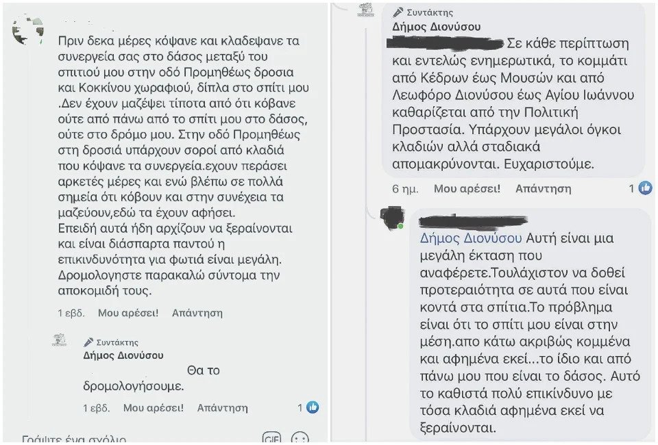 Οι δημότες του Δήμου Διονύσου αγκάλιασαν την επιχείρηση, αφού για πρώτη φορά έβλεπαν ότι κάτι καλό πήγαινε να γίνει. Ωστόσο ο… θησαυρός αποδείχθηκε άνθρακες! Αφού κλάδεψαν και έκοψαν ό,τι ήταν επικίνδυνο σε αρκετές κοινότητες του Δήμου, τα συνεργεία παράτησαν τα κομμένα κλαδιά, τους θάμνους και τα δέντρα στα σημεία όπου τα έκοψαν, με αποτέλεσμα να ξεραθούν και να αποτελούν άμεσο κίνδυνο για πυρκαγιά και μάλιστα κοντά σε κατοικίες! Υπήρχαν περιοχές όπου έγινε αποκομιδή των κλαδιών και θάμνων, αλλά αυτό συνέβη σε ελάχιστα σημεία.