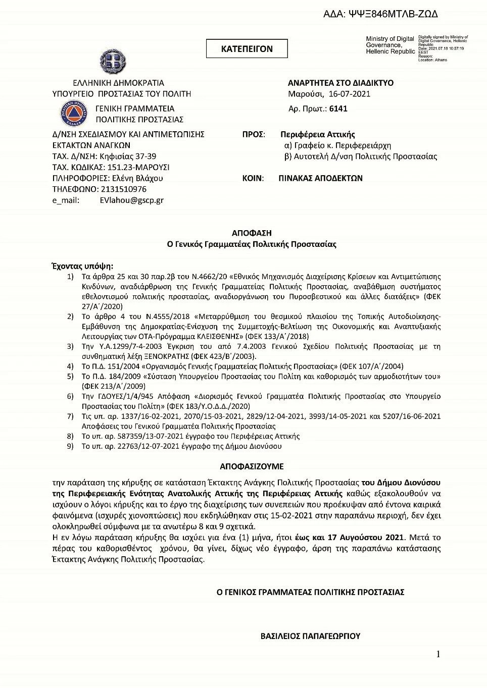 Σύμφωνα με το έγγραφο μόλις πριν από μια εβδομάδα, συγκεκριμένα στις 16 Ιουλίου, η Γενική Γραμματεία Πολιτικής Προστασίας είχε αποφασίσει την παράταση για έναν μήνα της κήρυξης του Δήμου Διονύσου σε κατάσταση έκτακτης ανάγκης, καθώς «εξακολουθούν να ισχύουν οι λόγοι κήρυξης και το έργο της διαχείρισης των συνεπειών που προέκυψαν από τα έντονα καιρικά φαινόμενα (ισχυρές χιονοπτώσεις) που εκδηλώθηκαν στις 15-2-2021 στην παραπάνω περιοχή».