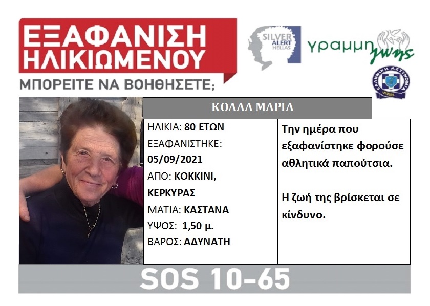Συναγερμός έχει σημάνει στην περιοχή Κοκκίνη στην Κέρκυρα, έπειτα από την εξαφάνιση της 80χρονης Μαρίας Κόλλα στις 5 Σεπτεμβρίου, μόλις 50 μέτρα από το κτήμα της.
