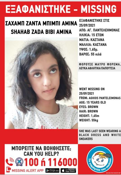 Η 15χρονη, σύμφωνα με την ανακοίνωση του Χαμόγελου του Παιδιού έχει ύψος 1,65 μ. και βάρος 55 κιλά και την ημέρα της εξαφάνισής της φορούσε μαύρο φόρεμα και λευκά αθλητικά παπούτσια.