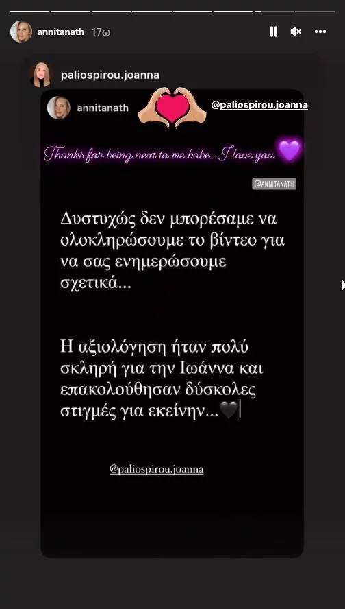 Το βίντεο όμως διακόπτεται και ακολουθεί μια ανακοίνωση της Αννίτας Ναθαναήλ, η οποία αναφέρει: «Δυστυχώς δεν μπορέσαμε να ολοκληρώσουμε το βίντεο για να σας ενημερώσουμε σχετικά… Η αξιολόγηση ήταν πολύ σκληρή για την Ιωάννα και επακολούθησαν δύσκολες στιγμές για εκείνη…».