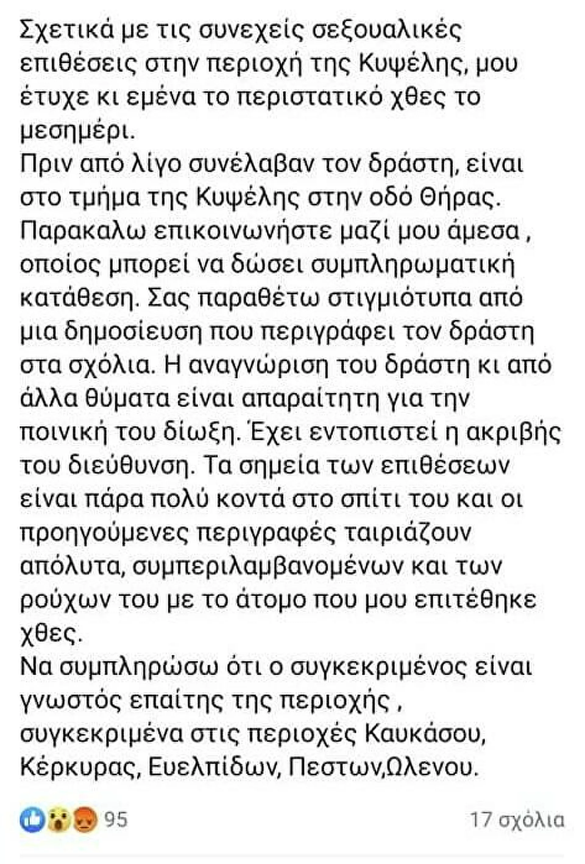 «Σχετικά με τις συνεχείς σεξουαλικές επιθέσεις στην περιοχή της Κυψέλης, μου έτυχε κι εμένα το περιστατικό χθες το μεσημέρι» αναφέρεται σε σχετική ανάρτηση.