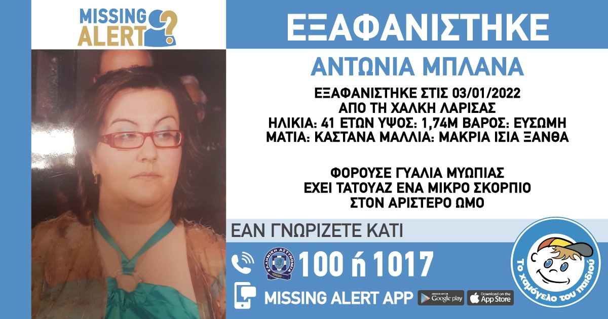 Στις 3 Ιανουαρίου 2022, εξαφανίστηκε από την περιοχή της Χάλκης της Λάρισας, η Μπλάνα Αντωνία, 41 ετών. Το «Χαμόγελο του Παιδιού» ενημερώθηκε για την εξαφάνιση της Μπλάνα Αντωνίας, σήμερα στις 17/1/2022 και προχώρησε στη δημοσιοποίηση των στοιχείων της ενήλικης κατόπιν αιτήματος της οικογένειας, καθώς ενδέχεται να συντρέχουν λόγοι οι οποίοι θέτουν τη ζωή της σε κίνδυνο.