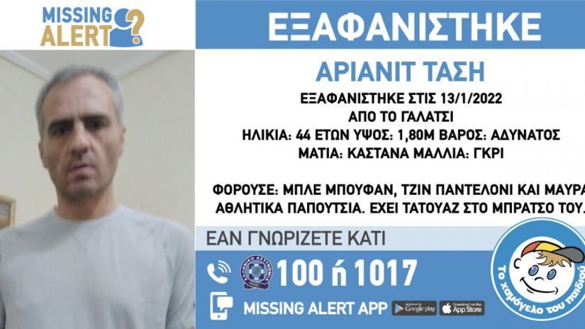Πρόκειται για την εξαφάνιση του 44χρονου Αριανίτ Τάση, ο οποίος εξαφανίστηκε από τις 13 Ιανουαρίου από την περιοχή του Γαλατσίου και το Χαμόγελο του Παιδιού ενημερώθηκε για αυτή σήμερα Πέμπτη (25.2.2022), για αυτό και δημοσιεύει τα στοιχεία του.