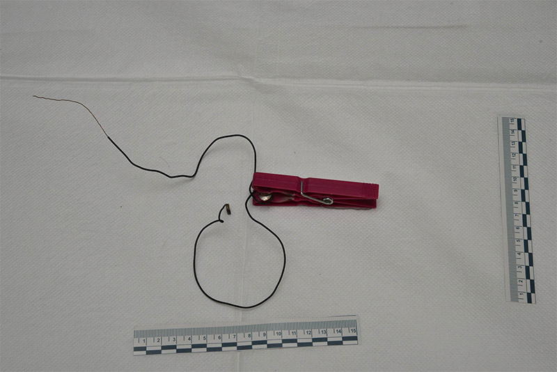 – πλαστικό μανταλάκι, με επικολλημένο κομμάτι χαρτιού με άγνωστη στερεή ουσία,