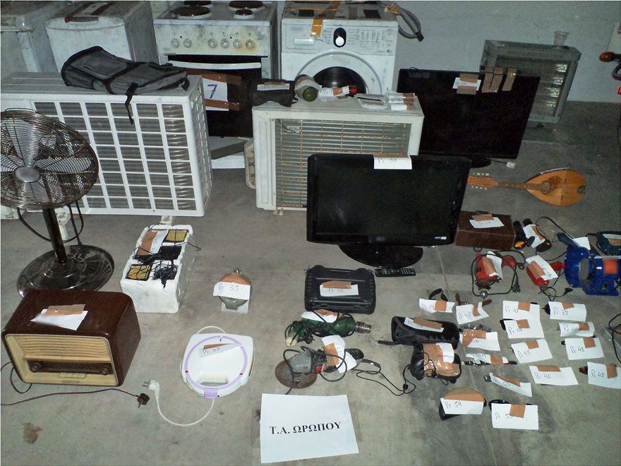Έπειτα από έρευνες που πραγματοποιήθηκαν σε συνολικά τέσσερις οικίες και δύο αποθήκες βρέθηκαν και κατασχέθηκαν πλήθος ηλεκτρικών και ηλεκτρονικών συσκευών, ηλεκτρικά εργαλεία, ποδήλατα, ρολόγια, γυαλιά ηλίου, ρουχισμός οικιακός εξοπλισμός, κ.λπ.