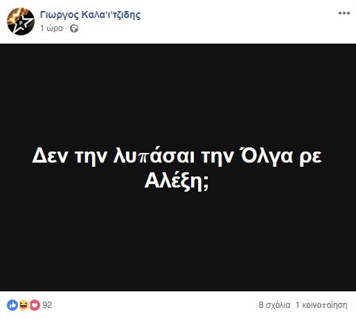 «Δεν την λυπάσαι την Όλγα ρε Αλέξη;» είναι η ανάρτηση-σχόλιο που, σε μαύρο φόντο, απειλεί να κάνει τη ζωή δύσκολη για την νέα ηγεσία στο υπουργείο Προστασίας του Πολίτη.