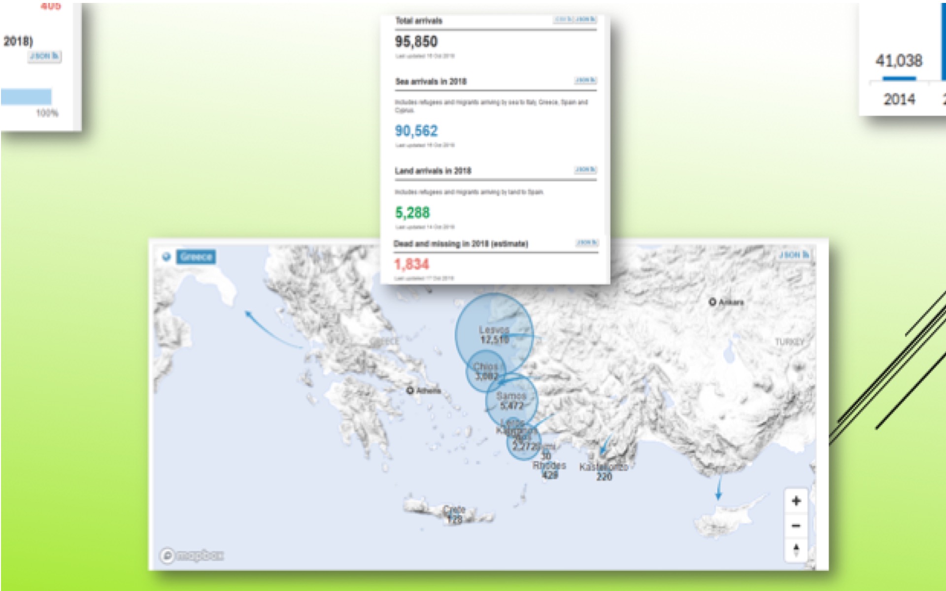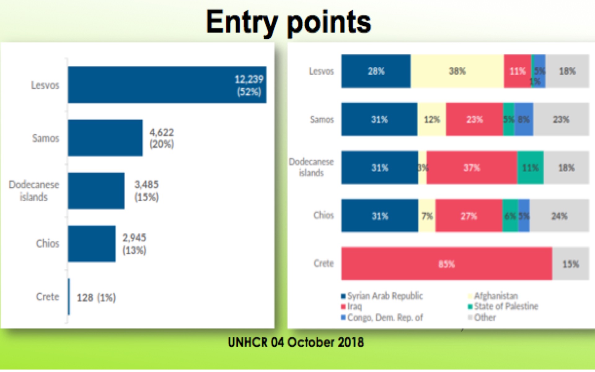 «Κατά τους πρώτους εννέα μήνες του 2018, η πλειοψηφία των αλλοδαπών συριακής καταγωγής έφτασε στη Λέσβο (12,239), στη Σάμο (4,622) και στα Δωδεκάνησα (3,485), με τη Λέσβο να λαμβάνει μεγαλύτερο αριθμό ανθρώπων από το Αφγανιστάν για το συνολικό αριθμό των θαλάσσιων αφίξεων στην Ελλάδα το 2018, ενώ στη Χίο κατέφθασαν παράνομα κυρίως οικογενειακές ομάδες από τη Συρία και το Ιράκ.