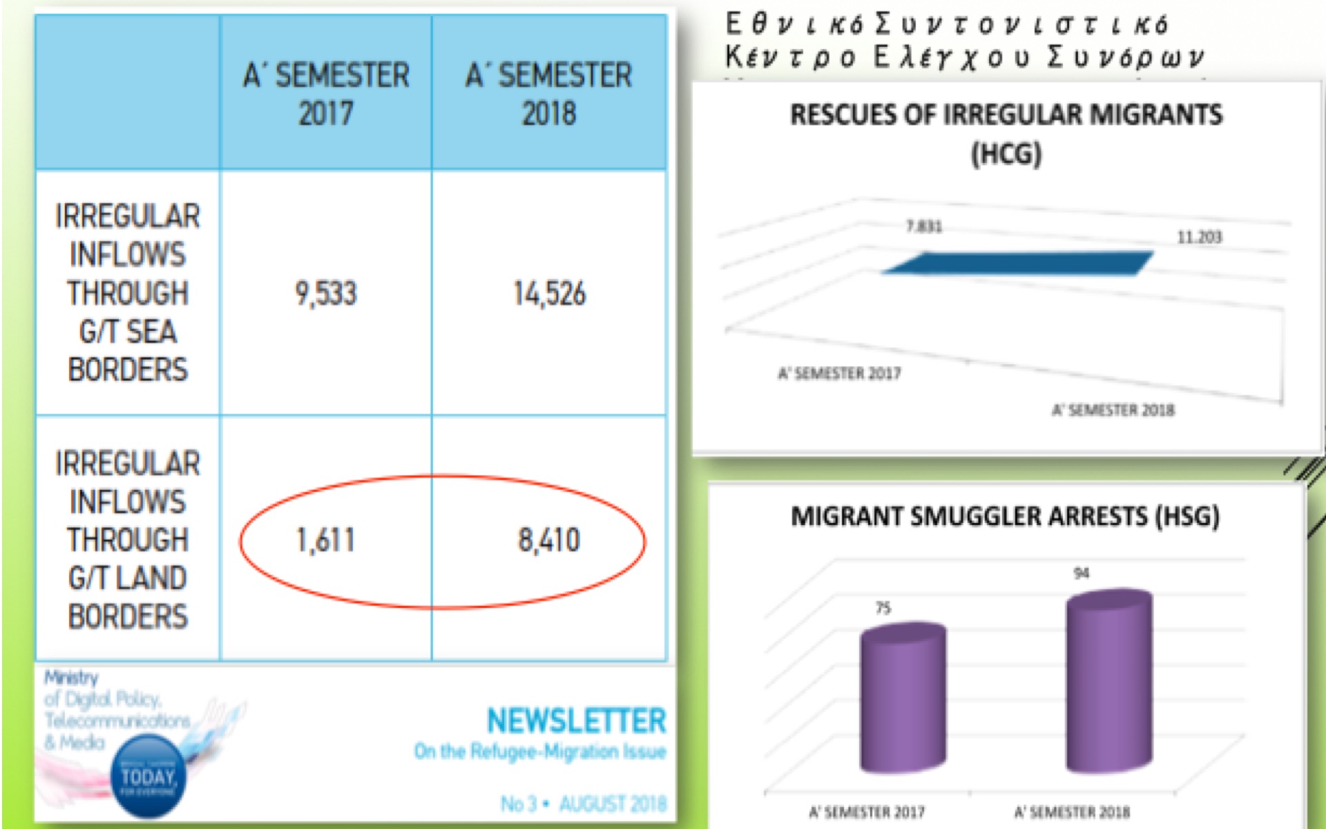Συγκεκριμένα σύμφωνα με το τελευταίο ενημερωτικό δελτίο που εκδόθηκε από το Εθνικό Συντονιστικό Κέντρο για τον έλεγχο των συνόρων, τη μετανάστευση και το άσυλο, οι παράτυπες εισροές μέσω ελληνοτουρκικών χερσαίων συνόρων ανήλθαν σε 8.410 το πρώτο εξάμηνο του 2018, όταν το αντίστοιχο εξάμηνο του 2017 ήταν μόλις 1.611.