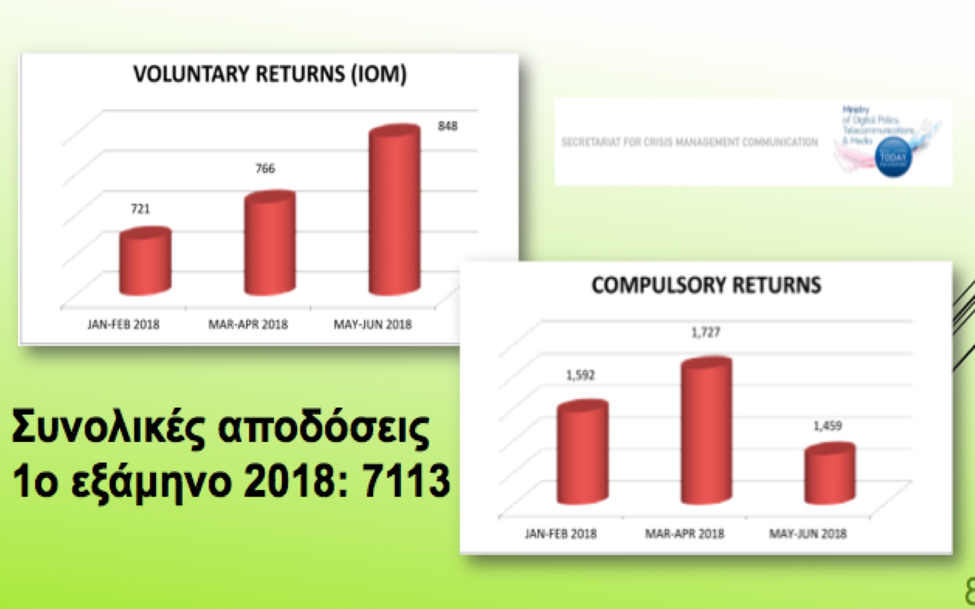 Από την άλλη ο συνολικός αριθμός των αποδόσεων – συμπεριλαμβανομένων εκείνων που βασίζονται στην κοινή δήλωση ΕΕ-Τουρκίας και τις εθελοντικές επιστροφές μέσω του Διεθνούς Οργανισμού Μετανάστευσης (ΔΟΜ) – ανήλθε σε 7.113 το πρώτο εξάμηνο του 2018.