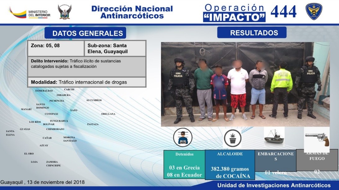 Συνολικά έχουν συλληφθεί εννέα άτομα, έξι στον Ισημερινό και τρεις στην Ελλάδα. Οι τρεις συλληφθέντες στην Ελλάδα είναι ένας 42χρονος ιδιοκτήτης καφετέριας που είναι γιος αστρολόγου, ένας 63χρονος ιδιοκτήτης μάντρας πολυτελών αυτοκινήτων και ένας 41χρονος Έλληνας αλβανικής καταγωγής, που είχε συλληφθεί στην Ιταλία για 250 κιλά χασίς.