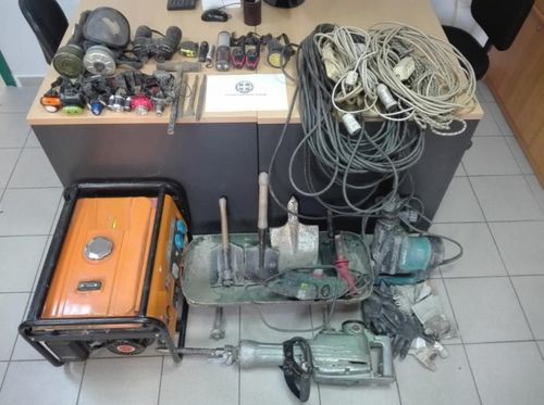 Στον χώρο της παράνομης ανασκαφής εντοπίσθηκαν και κατασχέθηκαν εργαλεία που χρησιμοποιούσαν: συγκεκριμένα, μία ηλεκτρογεννήτρια, τρεις αντιασφυξιογόνες μάσκες, 11 ηλεκτρικά και άλλα εργαλεία όπως φτυάρια, τρυπάνια κ.α., φορητές συσκευές ενδοεπικοινωνίας και άλλα αντικείμενα όπως γάντια εργασίας, φακοί, μετροταινία.
