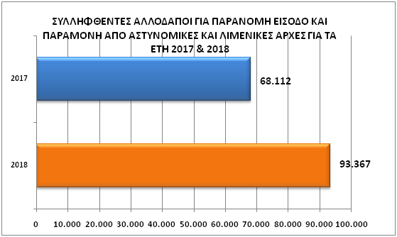 Πιο συγκεκριμένα σύμφωνα με την ΕΛΑΣ από τις αστυνομικές και λιμενικές Αρχές «συνελήφθησαν» το 2018 93.367 παράνομοι μετανάστες για παράνομη είσοδο στη χώρα (σημ. τουλάχιστον ακόμη παραδέχονται ότι πρόκειται περί παράνομης εισόδου!) έναντι 68.112 αλλοδαπών το 2017.