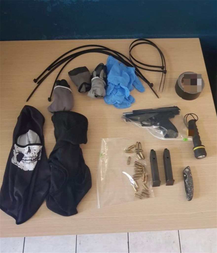 Και όντως, «έβγαλαν λαβράκι» καθώς στη βαλίτσα του βρέθηκαν ένα πυροβόλο όπλο των 9 χιλιοστών με αλλοιωμένο serial number το οποίο έφερε γεμιστήρα με επτά φυσίγγια, μία εφεδρική γεμιστήρα με τέσσερα φυσίγγια, δώδεκα φυσίγγια των 9χιλιοστών, τέσσερις κουκούλες full face, ένας σουγιάς, ένας φακός, δυο ζευγάρια γάντια μίας χρήσεως, ένα ζευγάρι υφασμάτινα γάντια, δεματικά τύπου tire up και μία μαύρη ταινία συκευασίας.