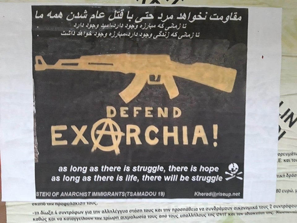 Είναι χαρακτηριστική η φωτογραφία που φαίνεται οι «αναρχικοί» μετανάστες να καλούν σε… άμυνα των Εξαρχείων. Μάλιστα στη φωτογραφία φαίνεται η αφίσα που έχουν κολλήσει στην οδό Νοταρά έχοντας βάλει και ένα Καλάσνικοφ, με την αφίσα να έχει φράσεις στα αραβικά και αγγλικά πλην ελληνικών (φυσικά).