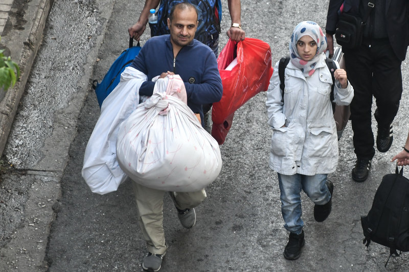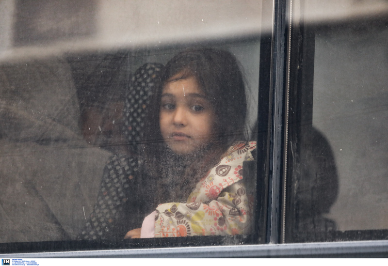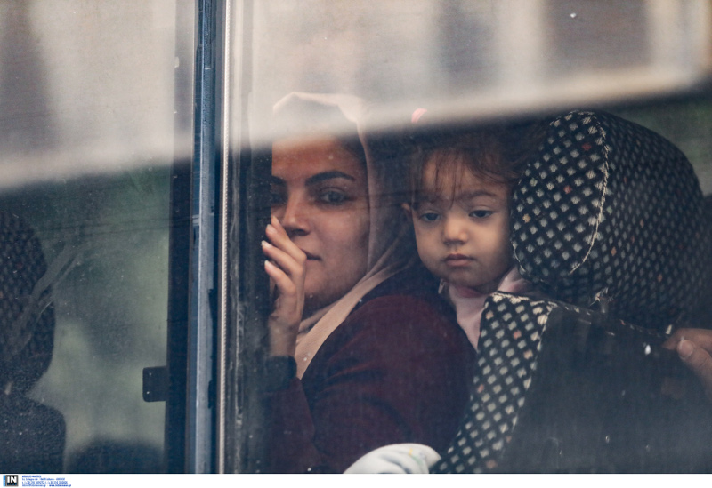 Ενδεικτικές είναι οι φωτογραφίες μητέρας που κρατά από το χέρι τα παιδιά της την ώρα που εγκαταλείπουν το κτίριο για να μπουν στα πούλμαν που θα τους μεταφέρουν σε δομές φιλοξενίας.