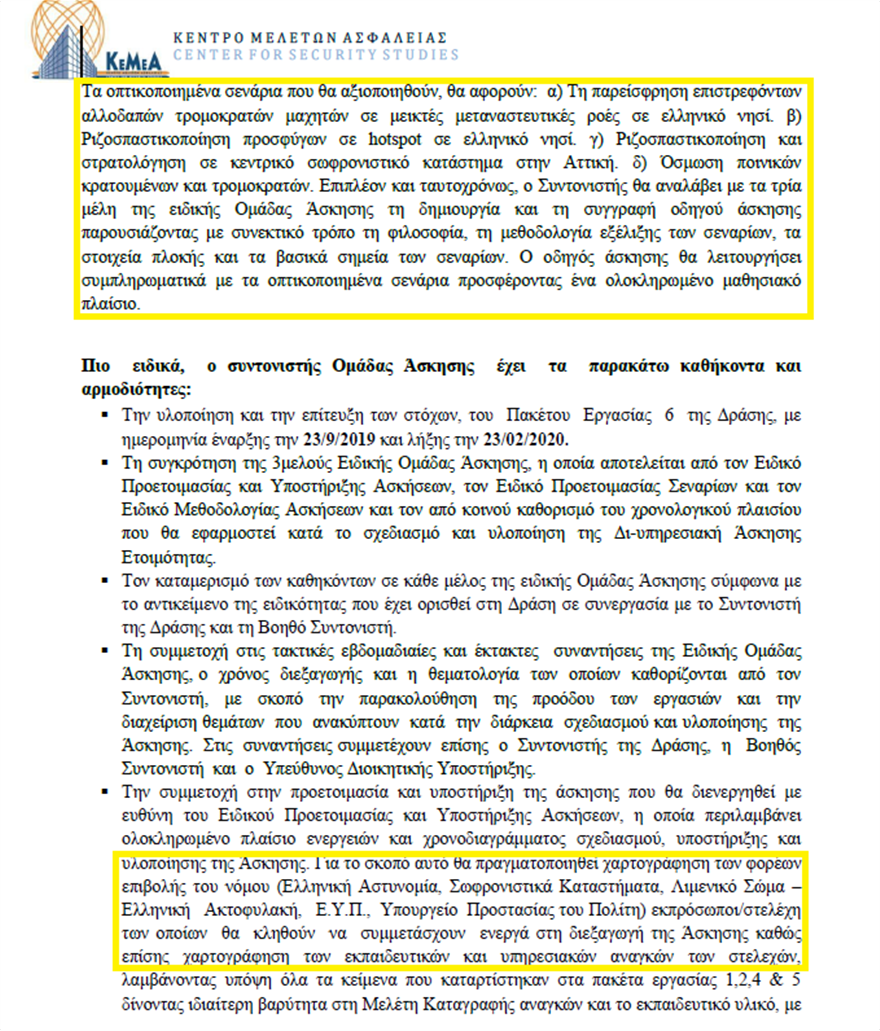 Στο πλαίσιο αυτό, προβλέπεται η δημιουργία και συγγραφή «οδηγού άσκησης παρουσιάζοντας με συνεκτικό τρόπο τη φιλοσοφία, τη μεθοδολογία εξέλιξης των σεναρίων, τα στοιχεία πλοκής και τα βασικά σημεία των σεναρίων. Ο οδηγός άσκησης θα λειτουργήσει συμπληρωματικά με τα οπτικοποιημένα σενάρια προσφέροντας ένα ολοκληρωμένο μαθησιακό πλαίσιο». Για το σκοπό αυτό «θα πραγματοποιηθεί χαρτογράφηση των φορέων επιβολής του νόμου (Ελληνική Αστυνομία, Σωφρονιστικά Καταστήματα, Λιμενικό Σώμα – Ελληνική Ακτοφυλακή, Ε.Υ.Π., Υπουργείο Προστασίας του Πολίτη) εκπρόσωποι/στελέχη των οποίων θα κληθούν να συμμετάσχουν ενεργά στη διεξαγωγή της Άσκησης καθώς επίσης χαρτογράφηση των εκπαιδευτικών και υπηρεσιακών αναγκών των στελεχών».