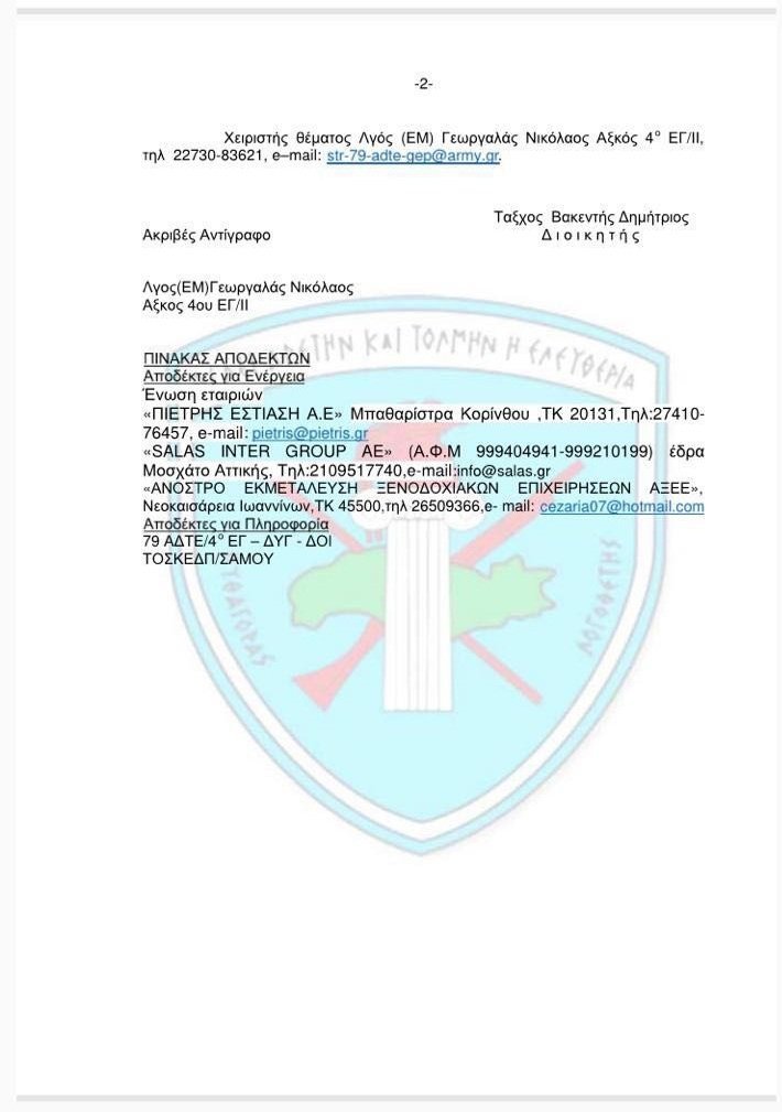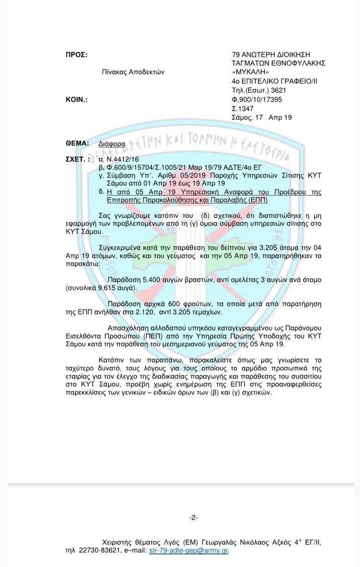 Οπως είχε καταγγείλει με έγγραφό της η ανώτερη στρατιωτική διοίκηση της Σάμου, η 79 ΑΔΤΕ πριν λίγους μήνες, εταιρείες είχαν (Πιέτρης, Σαλαπατάρας κλπ.) είχαν παραβεί τους όρους και τις προϋποθέσεις σίτισης, αναγκάζοντας την 79 ΑΔΤΕ να ασχολείται με θέματα σίτισης τη στιγμή που υπάρχουν πιεστικές ανάγκες εθνικής ασφάλειας, στην τεταμένη αυτή περίοδο στα ελληνο-τουρκικά.