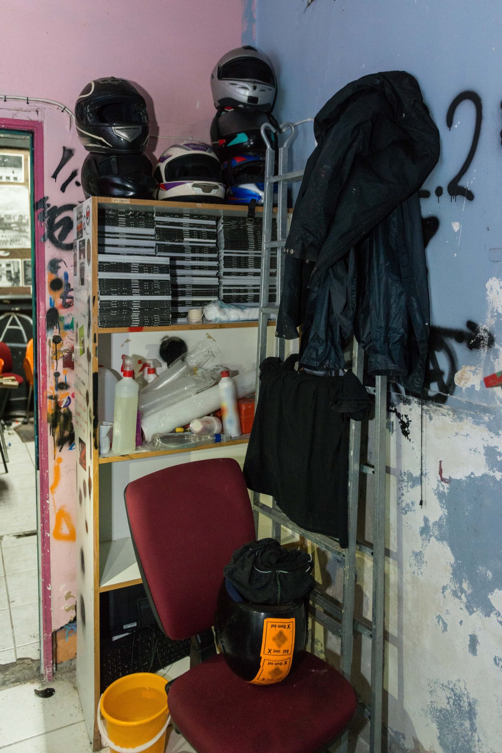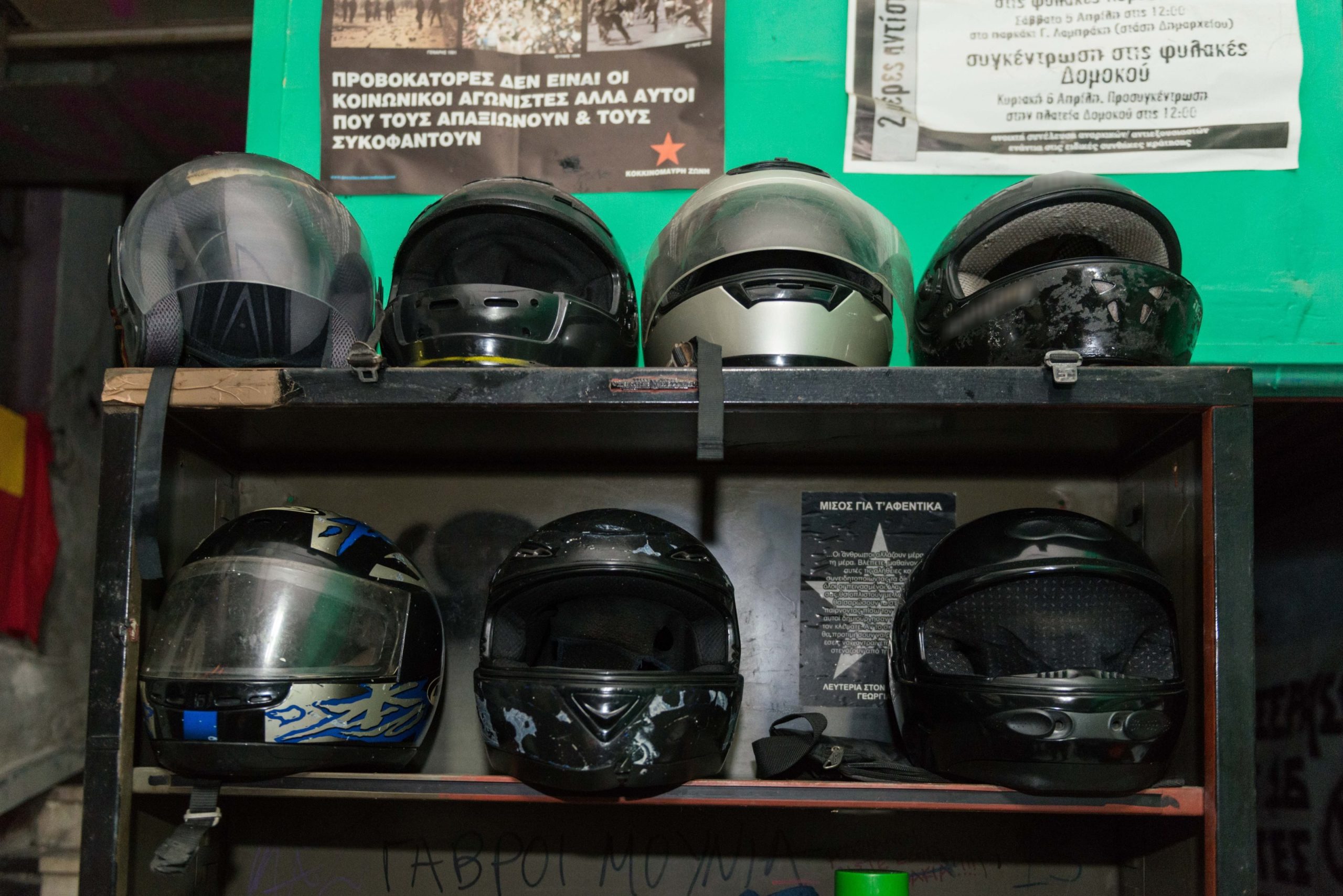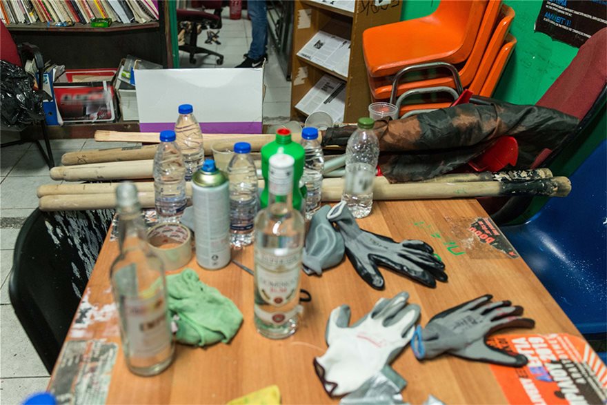 Κατά τη διάρκεια της έρευνας βρέθηκαν και κατασχέθηκαν, μεταξύ άλλων, κοντάρια, κράνη, γάντια, κουκούλες full face και ρούχα-υλικά αμφίεσης για κάλυψη χαρακτηριστικών καθώς και πυροσβεστήρες, διαρρηκτικά εργαλεία, φυλλάδια αναρχικού περιεχομένου και κομμάτια από μάρμαρα και πέτρες που χρησιμοποιούνται σε επιθέσεις.