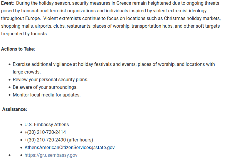 Συμβάν: Κατά τη διάρκεια της εορταστικής περιόδου, τα μέτρα ασφαλείας στην Ελλάδα, παραμένουν σε υψηλά επίπεδα, εξαιτίας των συνεχιζόμενων απειλών που παρουσιάζουν διεθνικές τρομοκρατικές οργανώσεις και μεμονωμένα άτομα τα οποία εμπνέονται από βίαιη εξτρεμιστική ιδεολογία, σε όλη την Ευρώπη.