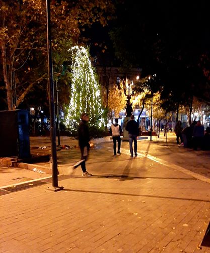 «Eνας ερασιτέχνης Νέρων φούντωσε με έναν αναπτήρα το χριστουγεννιάτικο δέντρο της πλατείας Εξαρχείων, έτρεξαν καταστηματάρχες το έσβησαν. Στέκει τώρα ελαφρώς καψαλισμένο, αντί φάτνης στη βάση του έχουν συγκεντρωθεί σκουπίδια – τα φωτάκια που είχαν τοποθετηθεί σε κορμούς δέντρων και κολόνες φυσικά ξηλώθηκαν ήδη». «Η φωτογραφία ελήφθη πριν από λίγο υπό τους ήχους μιας δυσοίωνης άγνωστης μουσικής που ξερνούσε ένα ογκώδες μηχάνημα, θα έλεγα κασετόφωνο, αλλά μάλλον θα μελαγχολήσω με την ηλικία μου» αναφέρει η κάτοικος της περιοχής.
