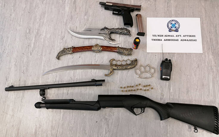 Ειδικότερα, σύμφωνα με την ΕΛ.ΑΣ, σε αστυνομικές έρευνες που πραγματοποιήθηκαν σε δύο οικίες στα Άνω Λιόσια, βρέθηκαν και κατασχέθηκαν: Κυνηγετική καραμπίνα, πιστόλι, είκοσι φυσίγγια, σπαθί, μαχαίρι, σιδερογροθιά, σπρέϊ πιπεριού και ασύρματος πομποδέκτης.