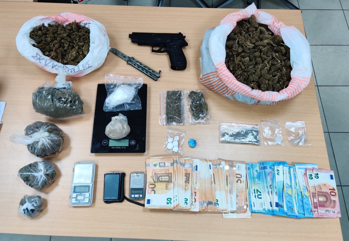 Ειδικότερα, σε έρευνες που διενεργήθηκαν στα σπίτια των συλληφθέντων, στα αυτοκίνητά τους και στην ντουλάπα, βρέθηκαν μεταξύ άλλων, 472 γραμμάρια κάνναβης σε εννέα συσκευασίες, 41,5 γραμμάρια ηρωίνης, 7,2 γραμμάρια κοκαΐνης σε εννέα συσκευασίες, 22 φυτά κάνναβης, ένα αεροβόλο πιστόλι με μεταλλικά σφαιρίδια, ένα στιλέτο τύπου πεταλούδας, ζυγαριές, το χρηματικό ποσό των 4.080 ευρώ κ.ά.