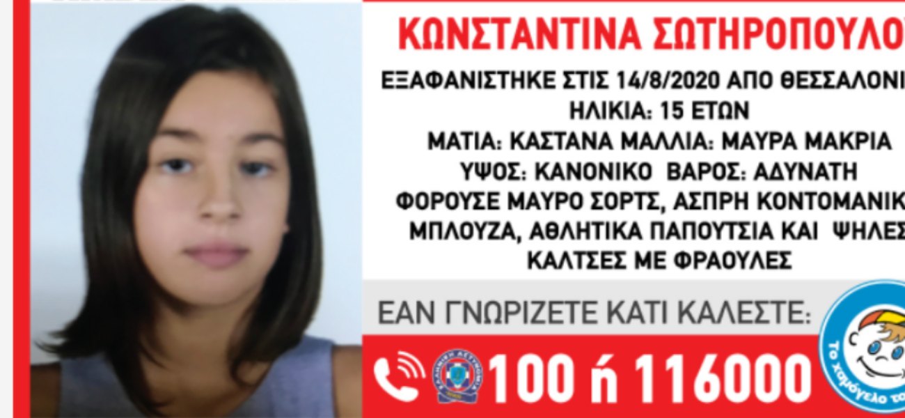 Το «Χαμόγελο του Παιδιού» ενημερώθηκε για την εξαφάνιση της ανήλικης Κωνσταντίνας Σωτηροπούλου, στις 15/8/2020 και προχώρησε άμεσα στην ενεργοποίηση του μηχανισμού AMBER ALERT HELLAS, καθώς συντρέχουν λόγοι οι οποίοι θέτουν την υγεία της σε κίνδυνο.