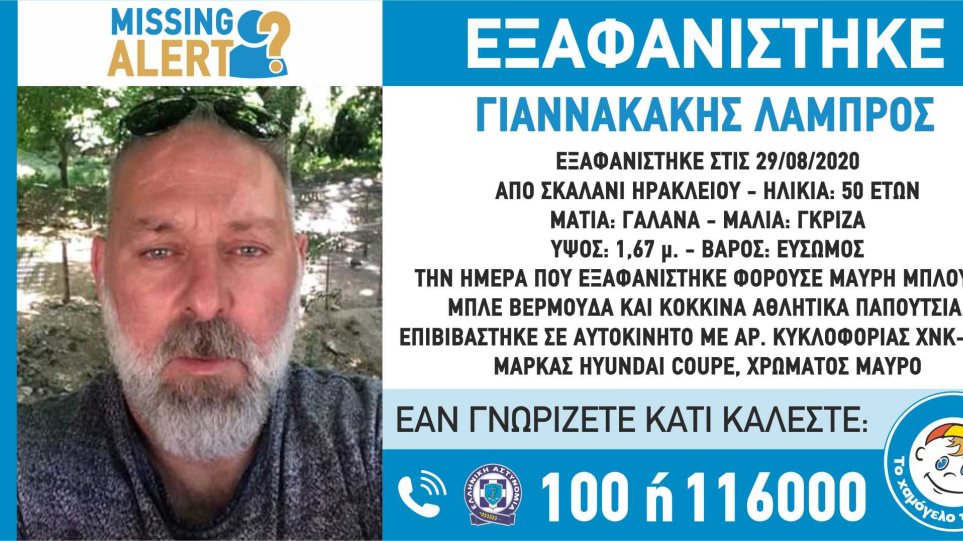 Άγνωστο παραμένει τι έχει συμβεί με τον 50χρονο Λάμπρο Γιαννακάκη που αγνοείται από το προηγούμενο Σάββατο και σήμερα εκδόθηκε missing alert για την περίπτωσή του.