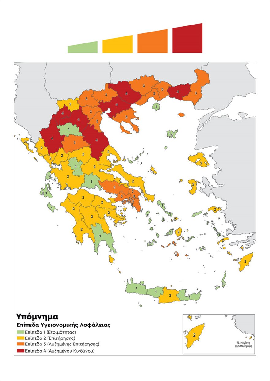 Στον νέο χάρτη εντάχθηκαν στο επίπεδο αυξημένου κινδύνου 4, «κόκκινο», οι περιφερειακές ενότητες Λάρισας, Θεσσαλονίκης και Ροδόπης μετά την έξαρση των κρουσμάτων.
