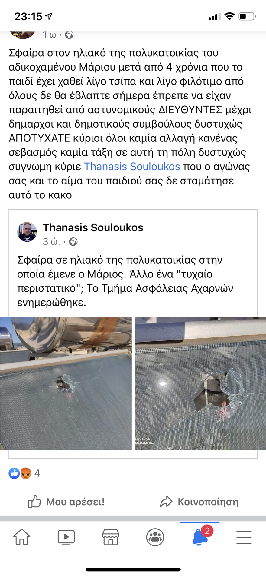 Συγκεκριμένα χρήστης του Facebook που αναδημοσιεύει της δημοσίευση του κ. Σουλούκου αναφέρει: «Σφαίρα στον ηλιακό της πολυκατοικίας του αδικοχαμένου Μάριου μετά από 4 χρόνια που το παιδί έχει χαθεί λίγο τσίπα και λίγο φιλότιμο από όλους δε θα έβλαπτε σήμερα έπρεπε να είχαν παραιτηθεί από αστυνομικούς ΔΙΕΥΘΥΝΤΕΣ μέχρι δήμαρχοι και δημοτικούς συμβούλους δυστυχώς ΑΠΟΤΥΧΑΤΕ κύριοι όλοι καμία αλλαγή κανένας σεβασμός καμία τάξη σε αυτή τη πόλη δυστυχώς συγνώμη κύριε Thanasis Souloukos που ο αγώνας σας και το αίμα του παιδιού σας δε σταμάτησε αυτό το κακό», ενώ παραθέτει και φωτογραφικό υλικό από τις σφαίρες που βρέθηκαν στον ηλιακό.