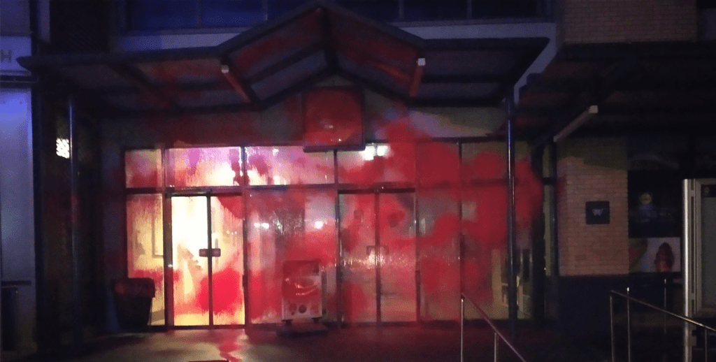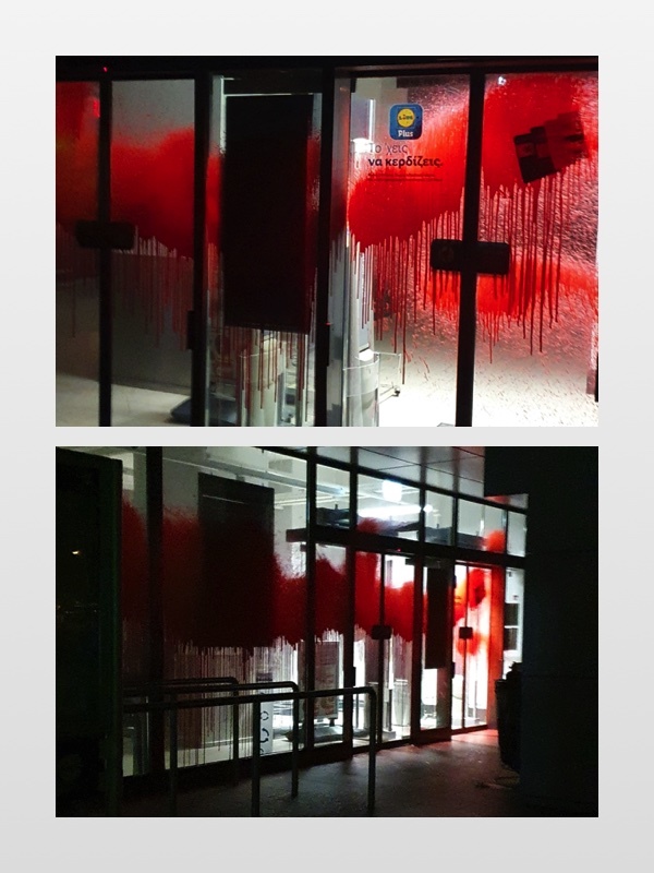 Οι δράστες πέταξαν κόκκινες μπογιές στις προσόψεις των σούπερ μάρκετ και έγραψαν συνθήματα ενώ κατά την πάγια πρακτική τους ανήρτησαν και κείμενο σε ιστοσελίδα τους.